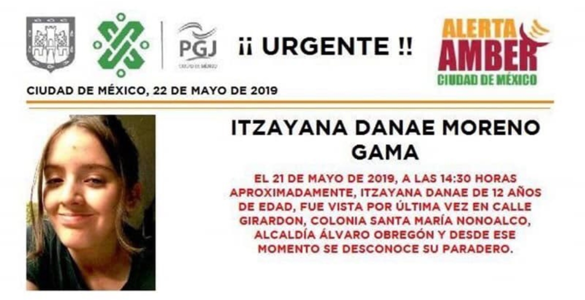 La Alerta Amber se activó para localizar a Itzayana Danae, quien fue vista por última vez en la colonia Santa María Nonoalco, en la alcaldía de Álvaro Obregón.