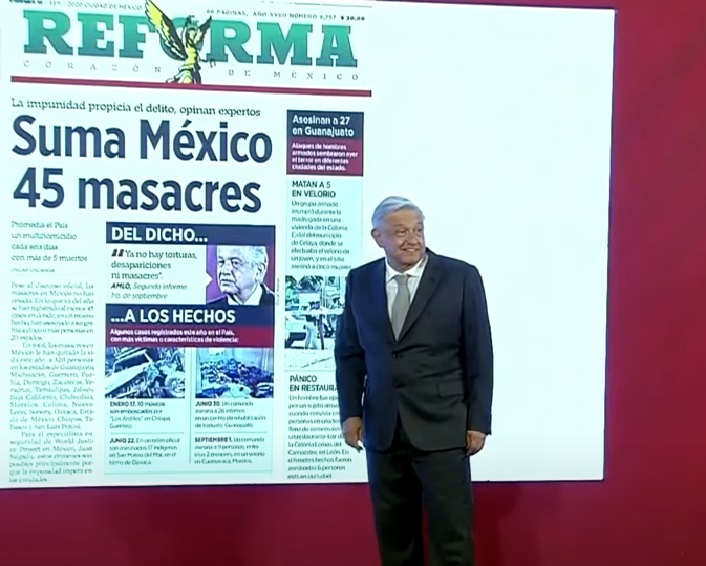 El presidente Andrés Manuel López Obrador se mofó de una nota del diario Reforma, en la que informan sobre las masacres en México.