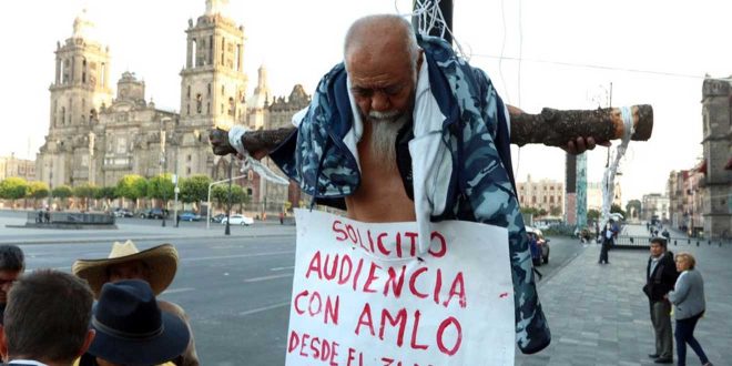 Un hombre de la tercera edad se amarró de pies y manos a un poste, a manera de crucifixión, para exigir una audiencia con el Presidente Andrés Manuel López Obrador.