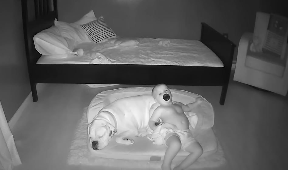 Las cámaras de seguridad captaron el momento en el que el bebé se baja de la cama para estar con su perro