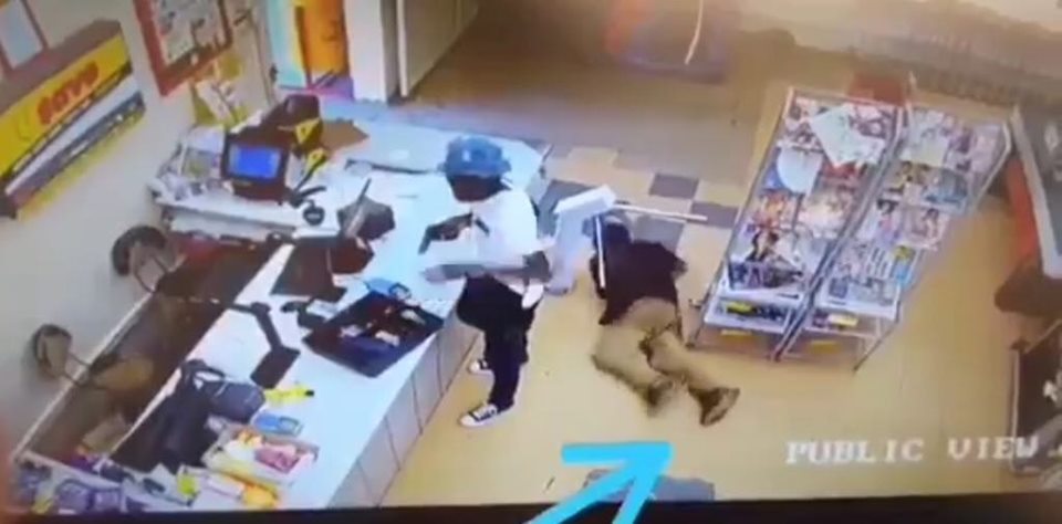 En la videograbación se observa cuando un sujeto con sombrero azul, que se encuentra parado frente al mostrador, porta un arma en su mano derecha mientras vacía la caja registradora y mete el dinero con la otra mano en un bolso, dejando caer algunos billetes al suelo.