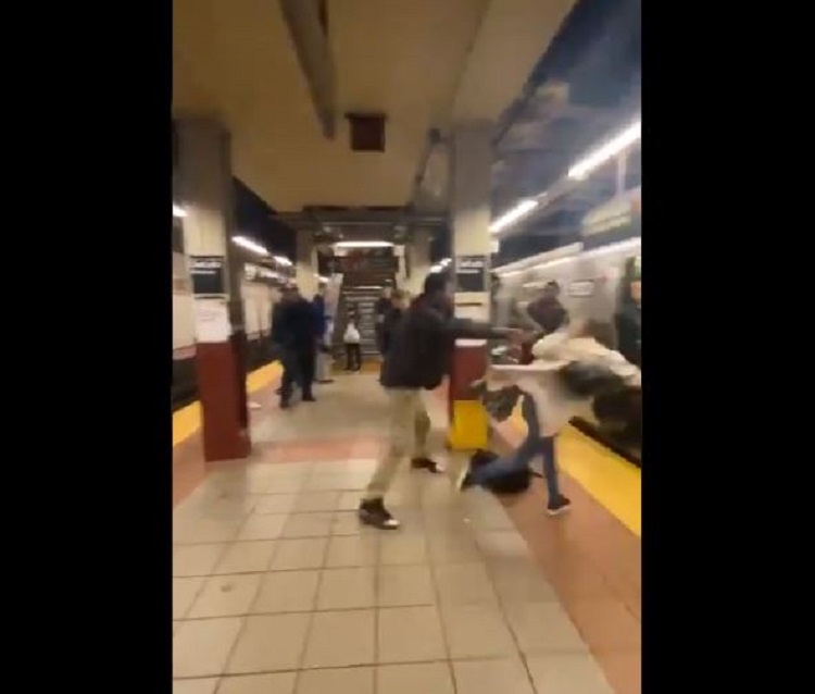 En el metro de Brooklyn, EU, un hombre que discutía con otros sujetos aventó a una mujer ajena a la situación en contra de un vagón.
