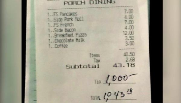 La mesera que lo atendió vio la propina acompañada de una nota de agradecimiento