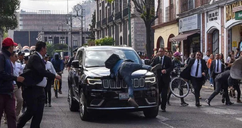 “Al paso de la unidad que iba a vuelta de rueda al menos dos jóvenes se pusieron frente a la unidad y se lanzaron hasta en cuatro ocasiones contra el cofre, mientras que personal de seguridad del recinto legislativo y de la Policía de Toluca intervenían para retirar a los jóvenes y justamente evitar algún accidente”, se explica en el documento de Morena.