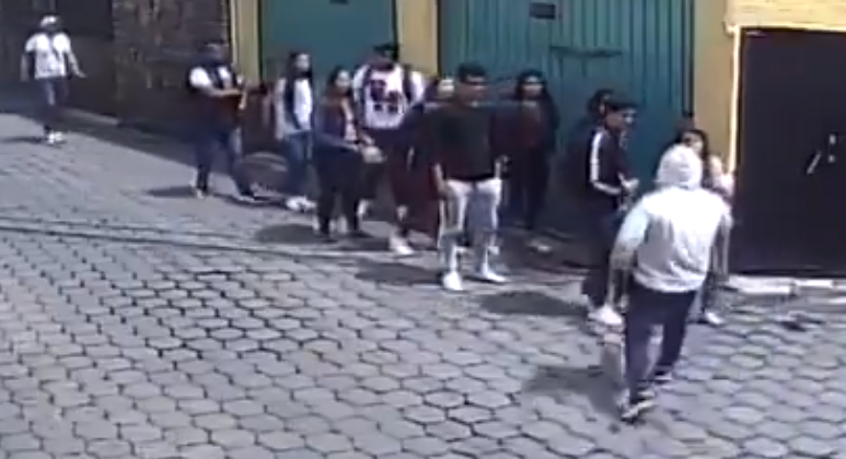 De acuerdo con un video compartido en redes sociales, un sujeto que portaba una sudadera blanca caminaba por la zona, detrás de él se encontraban al menos 10 alumnos y atrás de ellos una persona de playera y gorra blanca que seguía sus pasos.