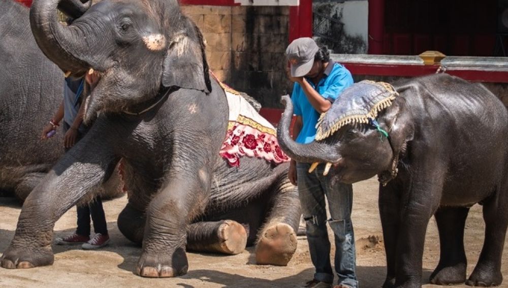 Un elefante bebé es obligado en un zoológico tailandés a actuar tres veces al día para complacer a los visitantes. Durante su espectáculo, el animal debe golpearse la cabeza al ritmo de la música, tocar un instrumento, realizar trucos y acrobacias.