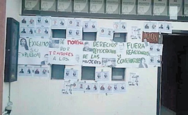 Activistas arribaron a las oficinas de Morena en Hidalgo, donde colocaron fotografías de los diputados que se abstuvieron o votaron en contra de la iniciativa de Interrupción Legal del Embarazo (ILE).