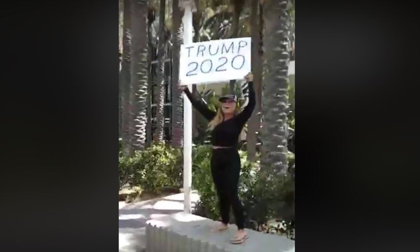 En las imágenes Karina motiva a un grupo de simpatizantes del mandatario a que coreen la frase “Trump 2020”, en referencia a una posible nominación del republicano a otro periodo de gobierno.