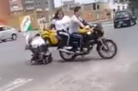 A través de un video fue exhibida una pareja que viajaba en una motocicleta y a su vez remolcaba una carreola sin protección, en Perú.