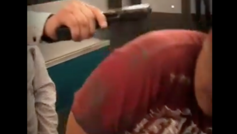 El clip muestra al funcionario sacar la pistola, misma que pone en la cabeza a otro hombre, y quien sólo se desplaza hacia atrás para esquivarlo.