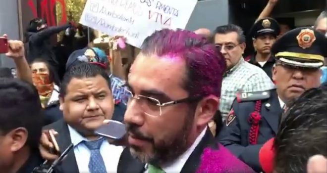 Además de pintar las oficinas de la SSC, le lanzaron diamantina de color rosa al titular de la dependencia, Jesús Orta, cuando salió para atender a las inconformes, sin embargo al intentar pintarlo con un aerosol varios elementos policiales lo impidieron.