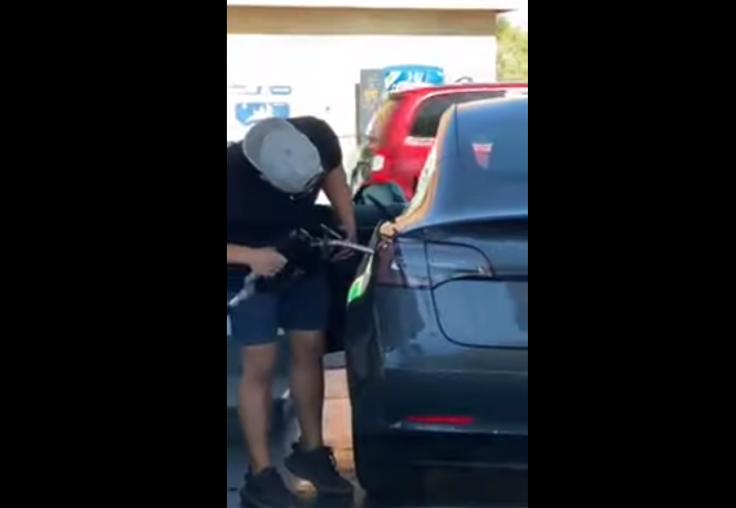 Posteriormente el conductor dejar el surtidor y en un segundo intento abre el maletero como opción para encontrar el depósito de gasolina de su vehículo nuevo. En su desesperación busca por todos lados otro vehículo Tesla, pero no tuvo suerte.