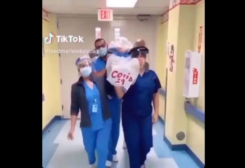 En redes sociales circula un video de TikTok en el que aparecen bailando cuatro enfermeros con lo que parece ser un cadáver embolsado y con la etiqueta ‘Covid-19’.