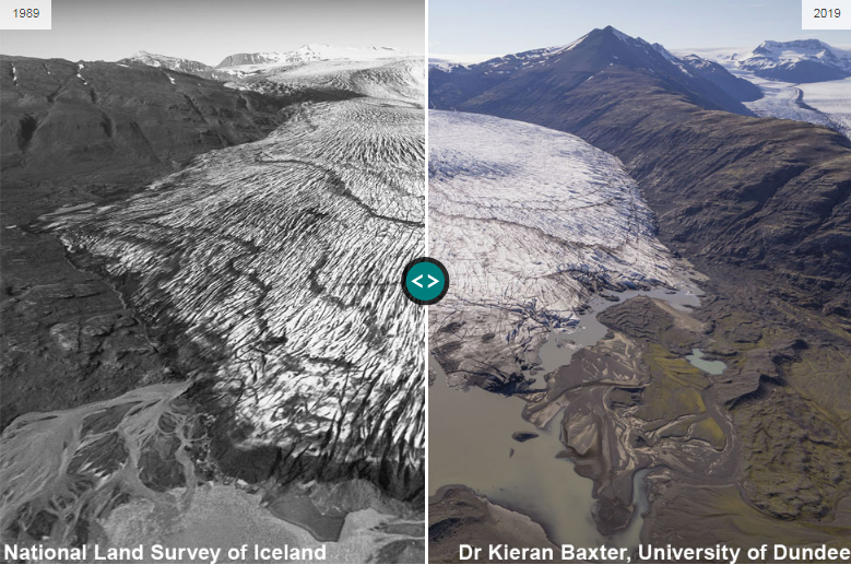 Un investigador de la Universidad de Dundee, en Reino Unido creó una serie de imágenes en las que combina fotografías de los años 80, con otras actuales para mostrar los ritmos del derretimiento de los glaciares en Islandia.