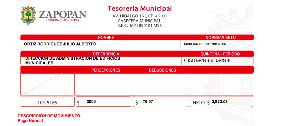 Cobra en el Ayuntamiento de Zapopan como auxiliar de intendencia en la Dirección de Servicios Municipales con un sueldo de 3 mil pesos quincenales.
