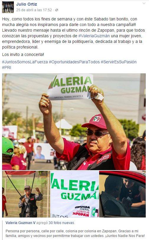Su sitio de Facebook presenta imágenes con el actual Presidente Municipal de Zapopan, Héctor Robles Peiro; con Salvador Rizo, candidato del PRI al Ayuntamiento de Zapopan, y presume trabajar también en la campaña con Valeria Guzmán, candidata de distrito 4 al Congreso de Jalisco.