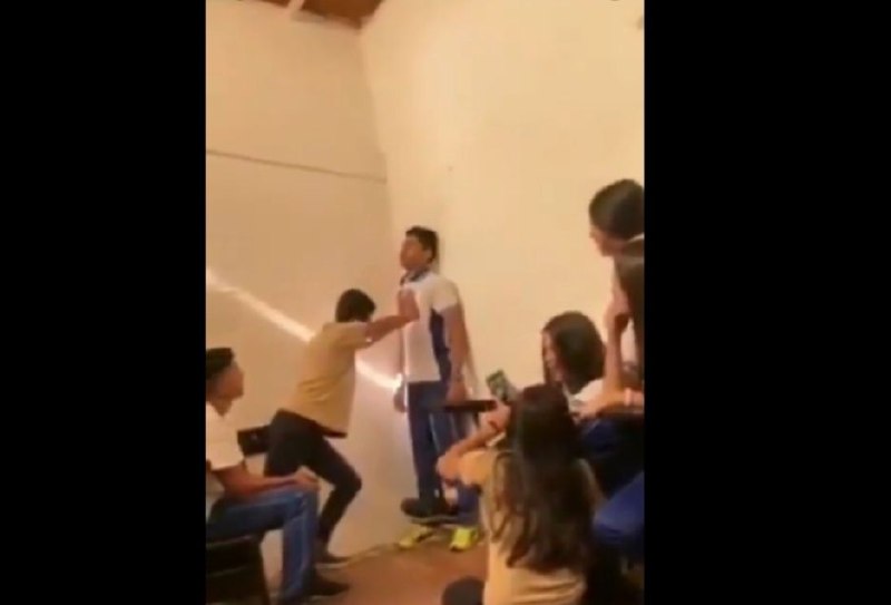 En un video que circula en Internet se aprecia que un adolescente presiona con las palmas de sus manos el pecho de uno de sus compañeros recargado en la pared.