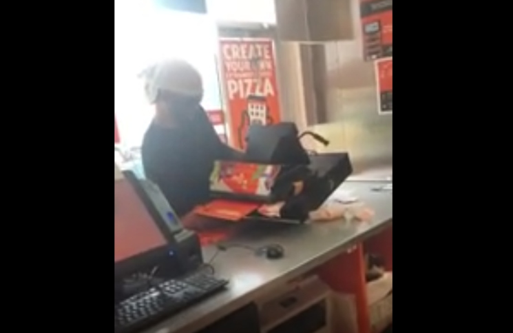 En redes sociales se ha hecho viral un video que muestra el momento en el que un ladrón intentó robar dinero de una de las cajas registradoras de una pizzería Little Caesar.
