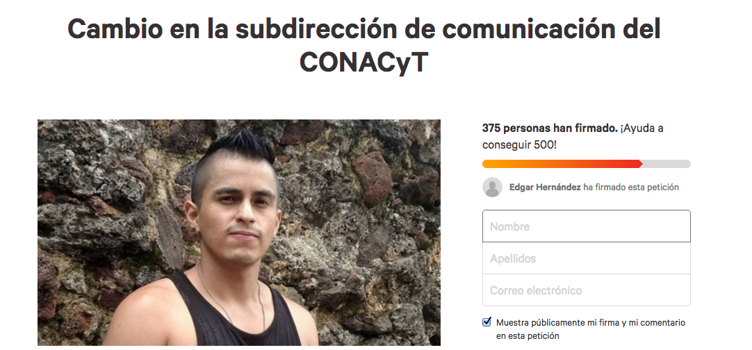 “La decisión de nombrar a personal con estudios acorde a la sub dirección de comunicación del CONACyT es de gran relevancia para la comunidad científica del país. Es necesario que tal posición sea cubierta por una persona con la suficiente preparación y que nos pueda representar a los científicos. Se gasta mucho tiempo, trabajo y dinero en formar gente preparada la cual afortunadamente existe en nuestro México. Por favor reaccione ante este error que lastima a toda la comunidad científica”, dice el texto que acompaña a la petición.