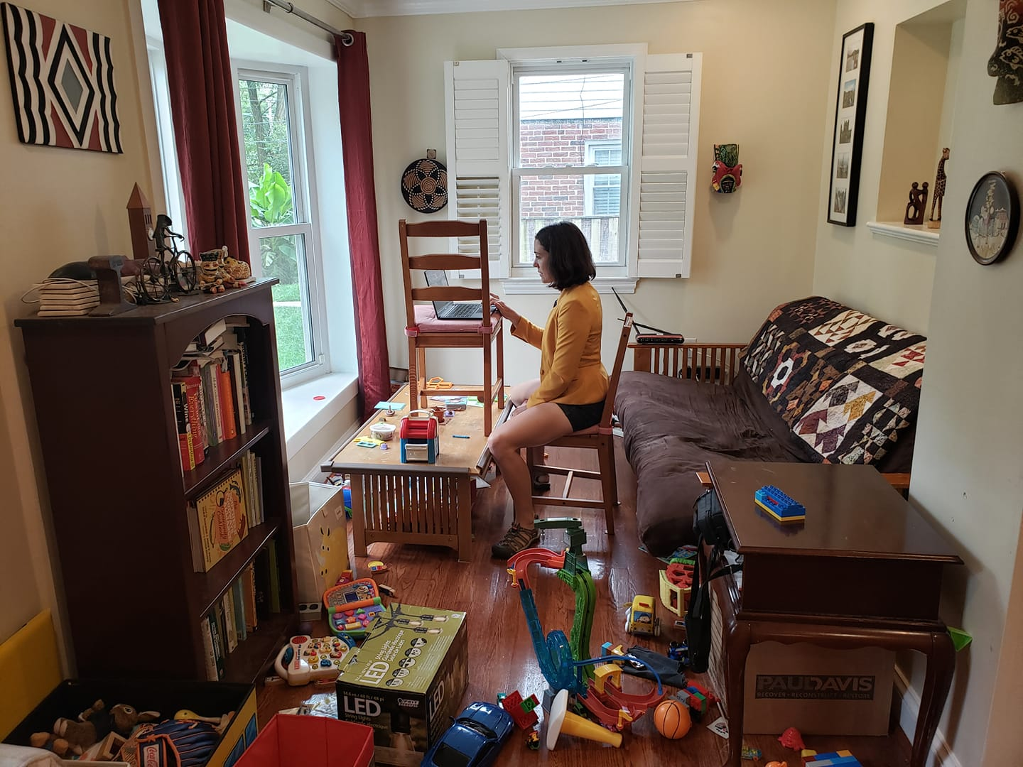 La mujer se ve rodeada por juguetes y varias cajas, la fotografía representa a millones de personas que buscan equilibrar su vida personal y laboral en el mismo espacio.