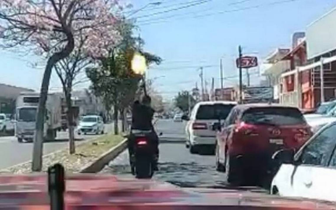En las imágenes se muestra que mientras la carroza se desplaza por la avenida Revolución, en la colonia Guadalupe Victoria, el conductor de una motocicleta dispara al aire una arma automática.