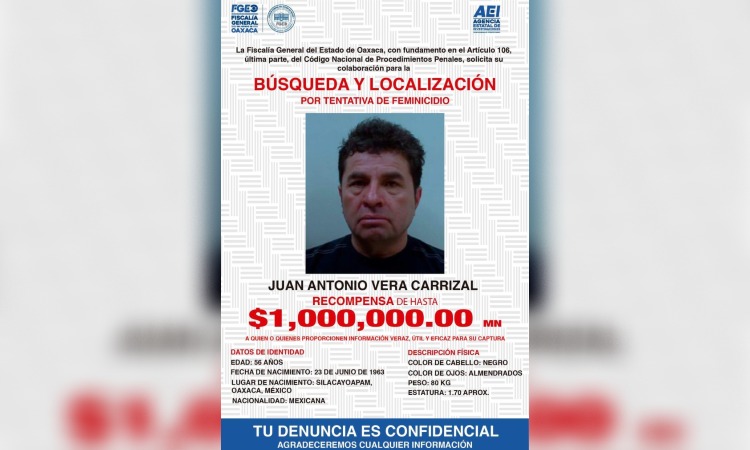 Por su parte, Rubén Vasconcelos Méndez, fiscal de Oaxaca, dio a conocer la ficha de Búsqueda y Localización de Vera Carrizal, a quien se le acusa del delito de tentativa de feminicidio, y en la que se señala que la denuncia se puede hacer de manera anónima.