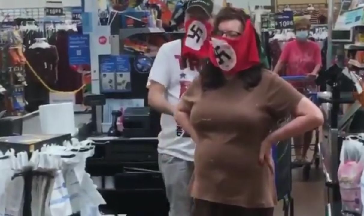 Una pareja de Minnesota, Estados Unidos, fue expulsada de un supermercado de la cadena Walmart por utilizar banderas con símbolos nazi como cubrebocas.