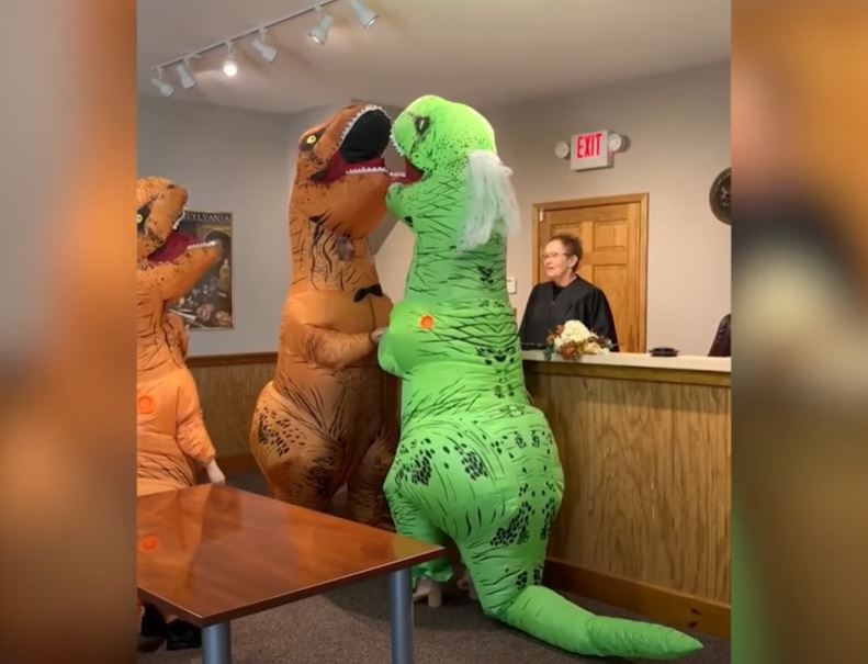 En un video que se ha hecho viral en redes sociales se puede ver a la pareja con sus trajes de Tiranosaurio Rex dándose el sí frente al juez.