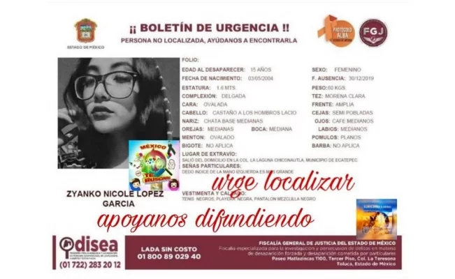 Zyanko Nicole López García, estudiante de la Vocacional 3 del Instituto Politécnico Nacional (IPN) fue reportada como desaparecida el pasado 30 de diciembre de 2019. Integrantes de la Célula de Búsqueda de Ecatepec la están buscando.