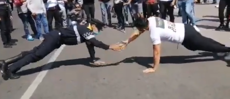 Un usuario de Twitter, identificado como Rodolfo Dorantes, compartió un video en el que se observa al ciudadano retar al oficial a realizar los ejercicios.