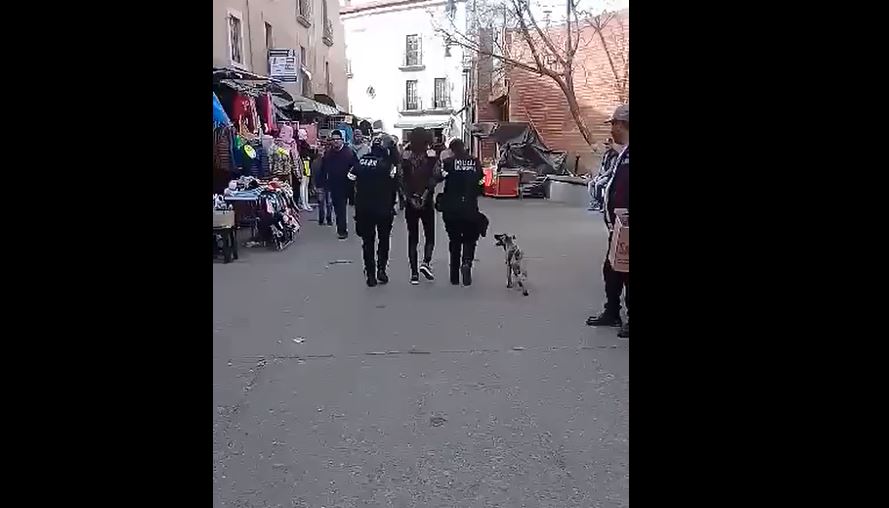 En un video difundido por la asociación y por la página Adopta una mascota Zacatecas, se puede ver el momento en el que el joven que caminaba por la zona comercial de la Plaza Bicentenario, ubicada en pleno Centro Histórico, cuando dos elementos policiales detienen al hombre, mientras su perrito corre desesperado detrás de él para impedir que se lo lleven.