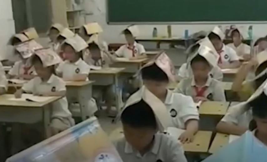En redes sociales se ha hecho viral un video en el que se puede ver cómo un maestro en una escuela de China obliga a sus alumnos a sostener un libro abierto sobre su cabeza para mantener una postura correcta.
