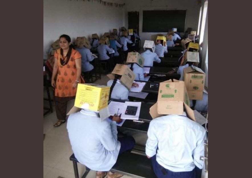 Una profesora del centro de estudios preuniversitarios Bhagat, ubicado en la ciudad de Haveri, en Karnataka, India, obligó a sus estudiantes a ponerse cajas de cartón en la cabeza para evitar que se copien entre ellos mientras realizan un examen.