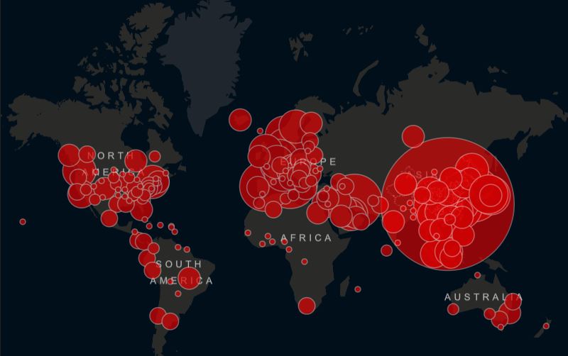 Investigadores del Centro de Ciencia e Ingeniería de Sistemas de la Universidad Johns Hopkins, en Baltimore, EU, realizaron un mapa que muestra en tiempo real el avance del coronavirus en el mundo.
