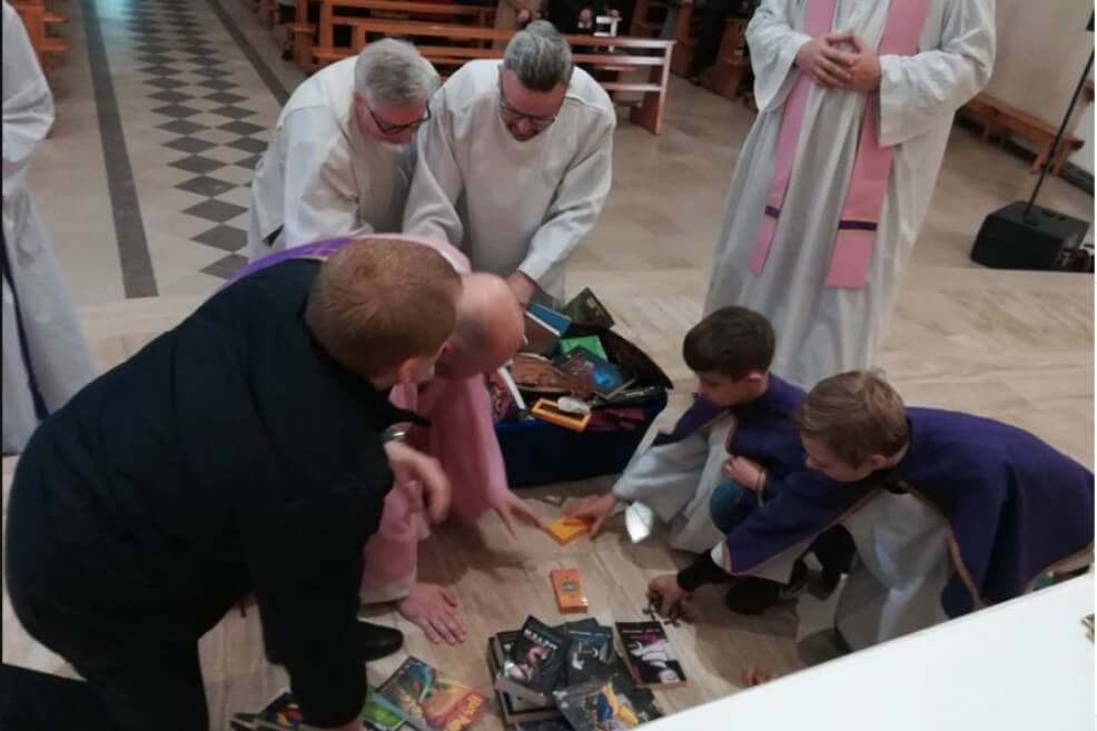 Los hechos fueron dados a conocer con imágenes difundidas a través de la página de Facebook del grupo religioso internacional conocido como “SMS from Heaven Foundation” (Fundacja SMS Z NIEBA). En ellas se puede ver a los sacerdotes vestidos con sotanas blancas junto a una pila de libros, figuras de Hello Kitty, máscaras y algunos elementos religiosos del hinduismo, colocados frente a un altar en un patio con un hoguera que encendieron con ayuda de niños y monaguillos.