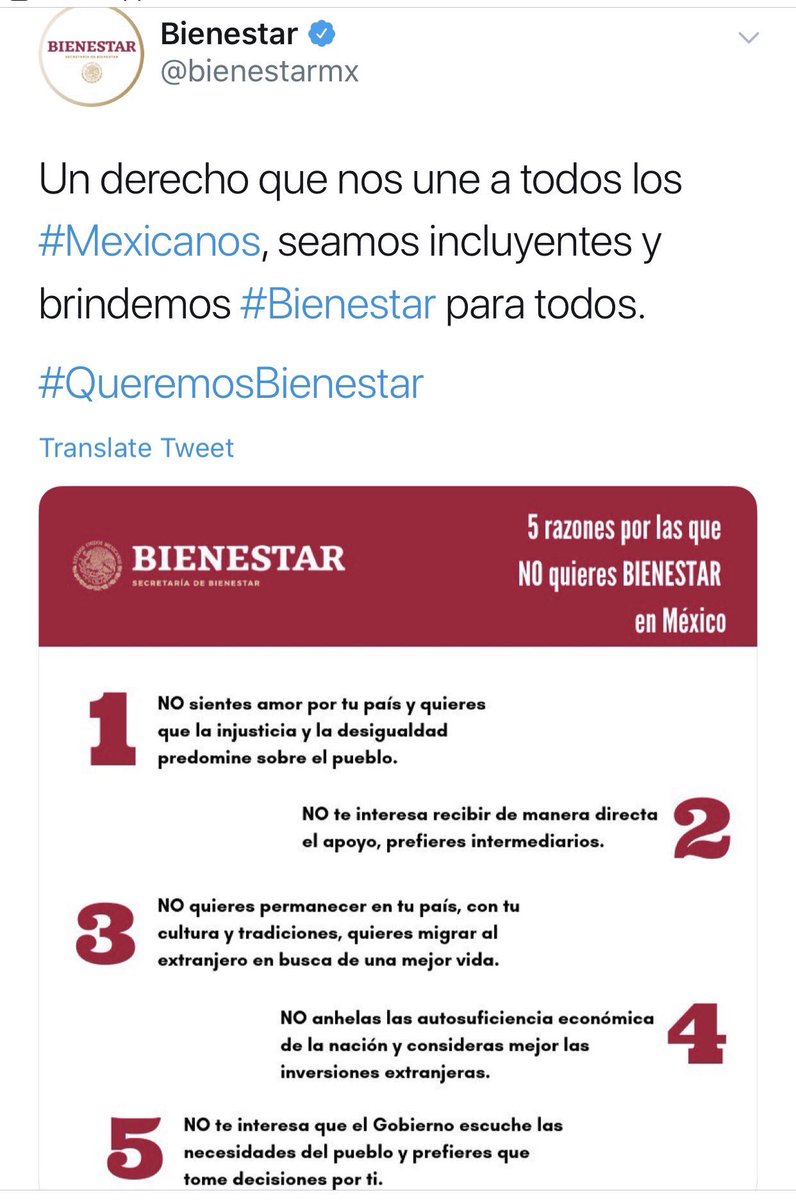 A través de su cuenta de Twitter, @bienestarmx, la dependencia hizo público el listado de las razones para “no querer el Bienestar” del país, aunque después lo retiró por la polémica que desató.