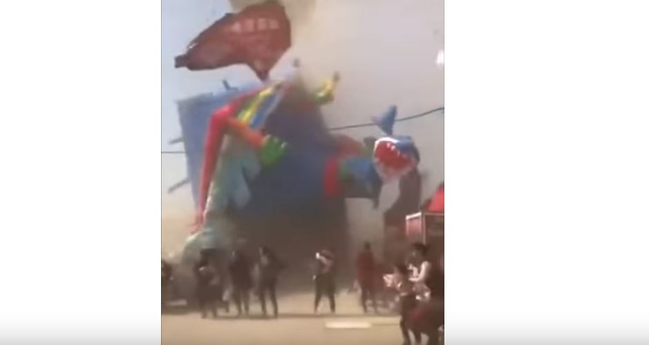 En las imágenes se puede ver cómo un castillo inflable vuela por los aires con varios niños dentro.