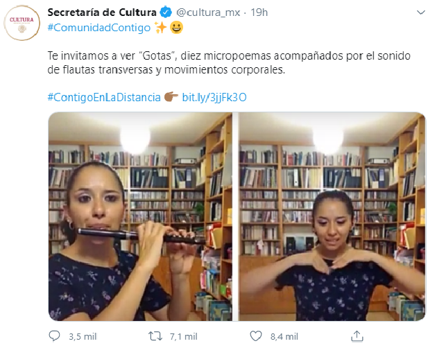 “Te invitamos a ver ‘Gotas’, diez micropoemas acompañados por el sonido de flautas transversas y movimientos corporales”, se lee en el tuit.