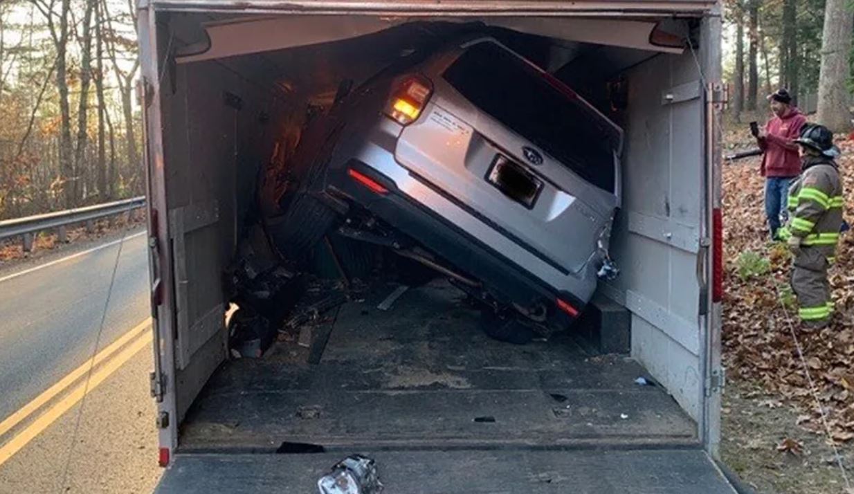 A través de su perfil de Facebook, el Departamento de Policía de Northampton explicó que el accidente ocurrió cerca de las 7 de la mañana. El conductor del automóvil llamó diciendo que había quedado atrapado en camión pero que no estaba herido. Cuando llegaron al lugar de los hechos, los oficiales vieron dentro del camión que había sido estacionado con la parte trasera abierta un auto empotrado dentro de la caja.