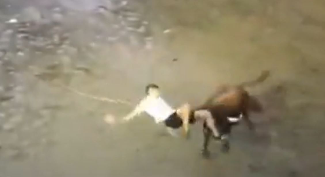 Un video, que captó el momento del incidente, muestra el momento en el que el joven se tropezó con la cuerda que sujetaba al animal y éste acabó lanzándolo por los aires.